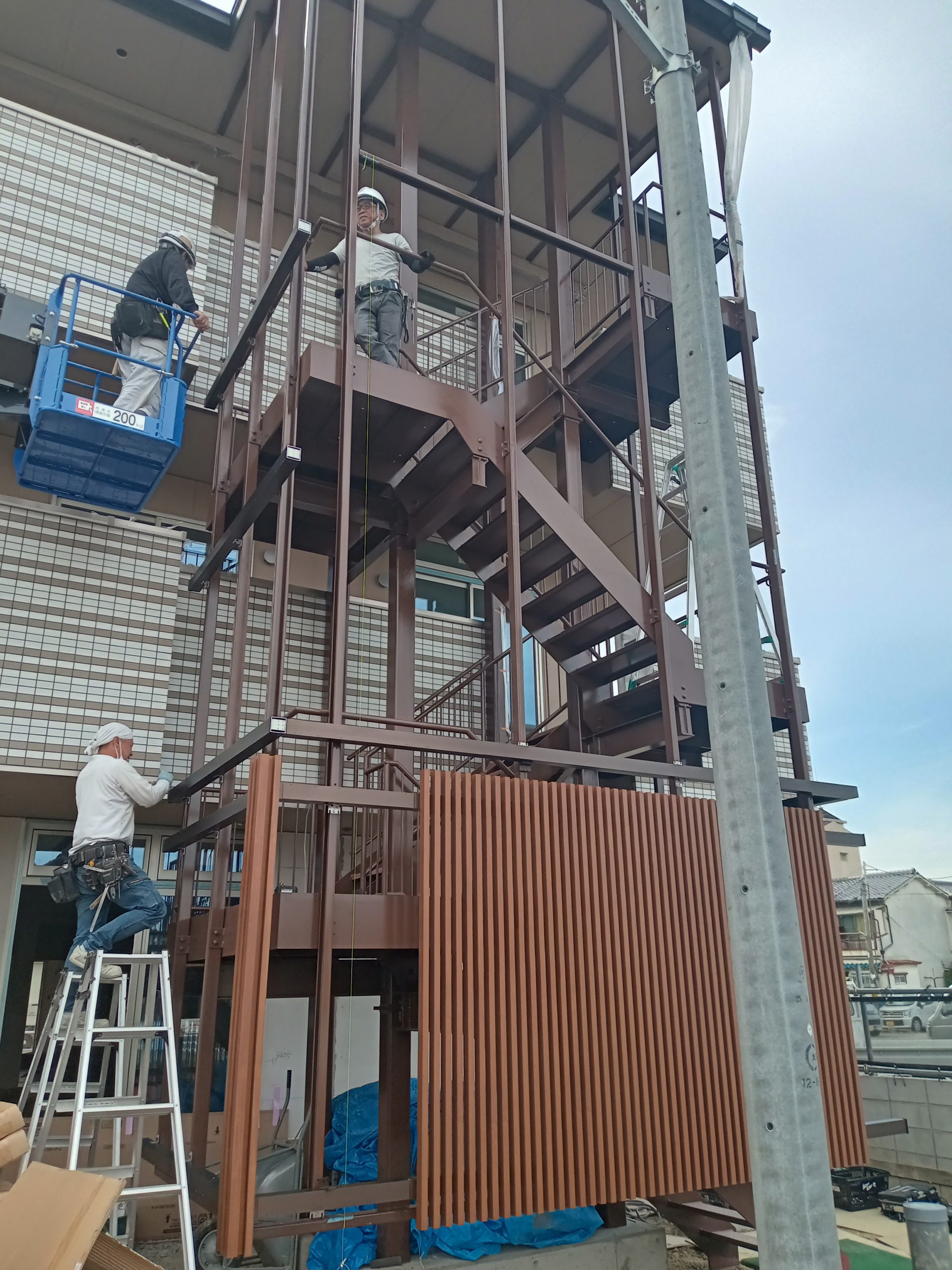 外部は、足場が外れ現在は、非常階段の工事をしてます。